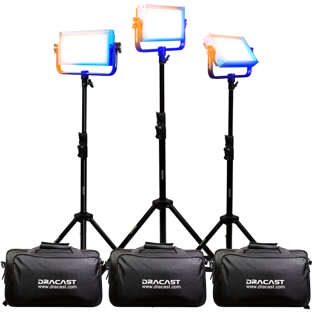 This kit includes three (3) Pro Series 500 LED panels in bi-color 3200K – 5600K variable color temperature. Also included with each panel is A/C power adapter, nylon padded travel case, and a Dracast DRDLS805 light stand.